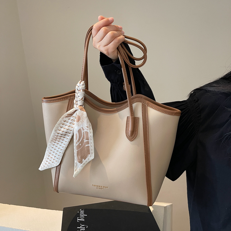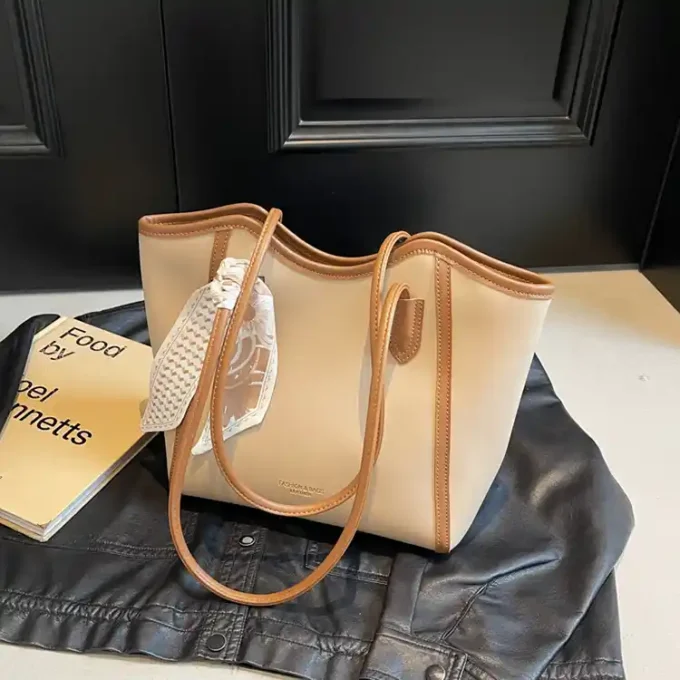 This chic and versatile beige tote bag is the perfect blend of elegance and functionality. Crafted from high-quality materials, it features a smooth leather trim that adds a refined touch to its minimalistic design. The included decorative scarf, delicately tied to the handle, enhances its fashionable appeal, making this bag a standout accessory for both casual outings and formal events.