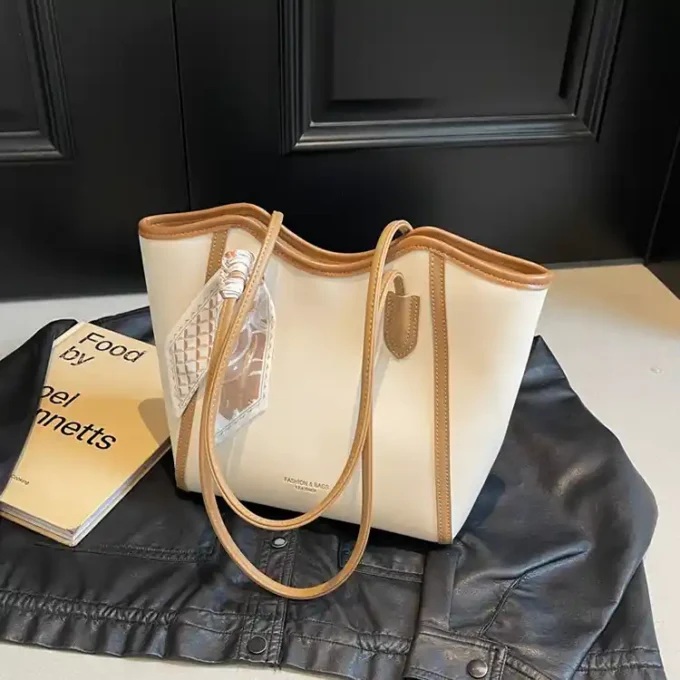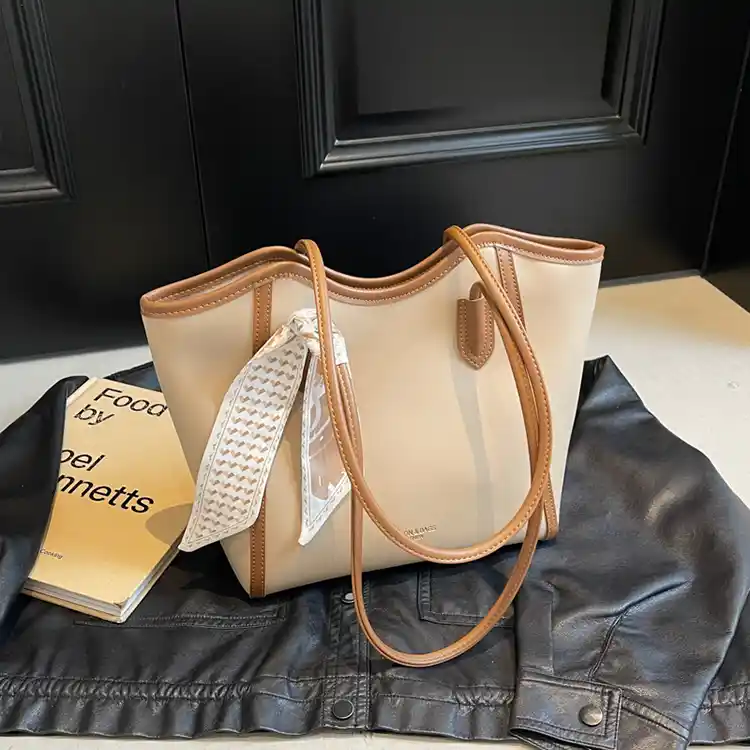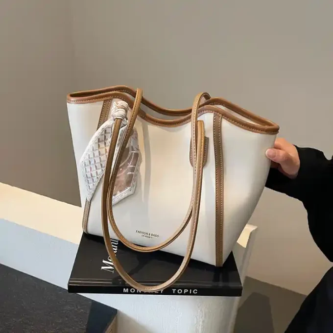 Product Name: Elegant Beige Tote Bag with Leather Trim and Scarf Accent