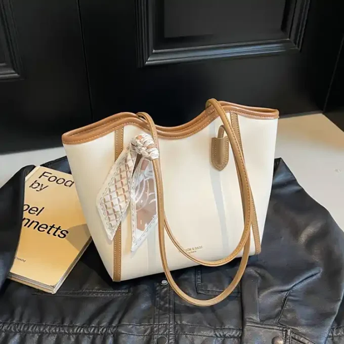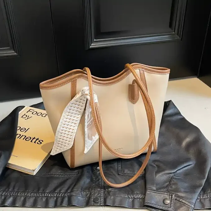 Elegant Beige Tote Bag with Leather Trim and Scarf Accent